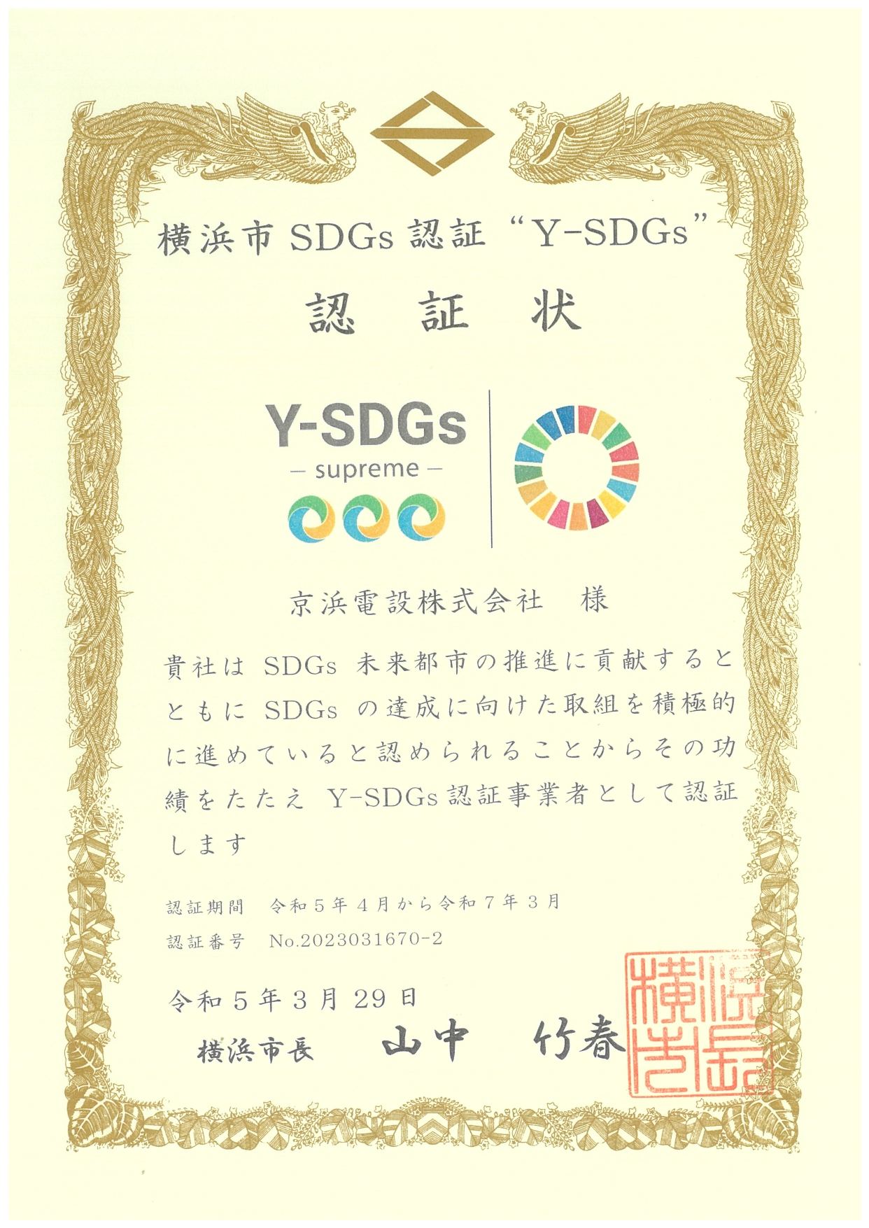 横浜市SDGs認証制度「Y-SDGs」の第9回認証事業で最上位の「Supreme(スプリーム)」認証を取得いたしました。